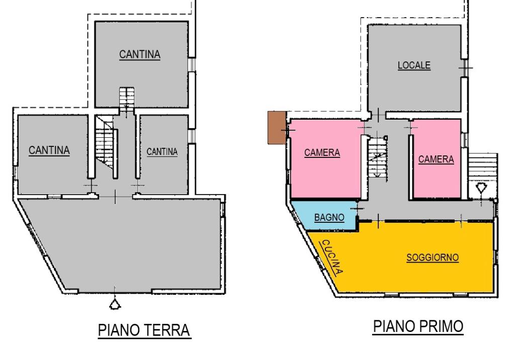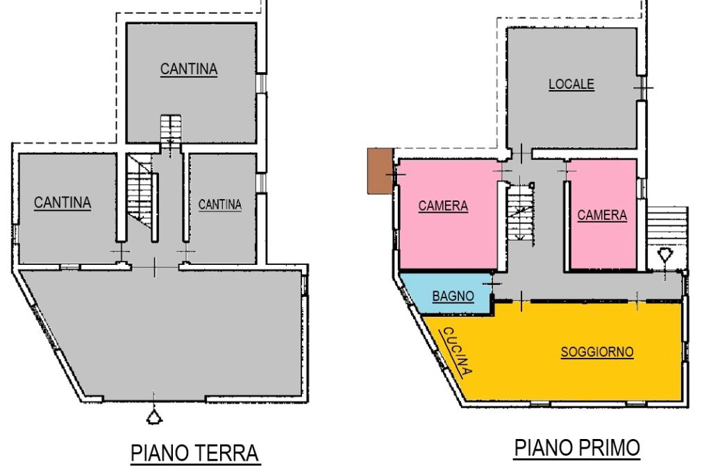 - Piano terra (circa 100 mq) composto da cinque locali cantinati adibiti a autorimessa, taverna, cantina, lavanderia e altri spazi di servizio, perfetti come ambienti accessori o per attività rurali.