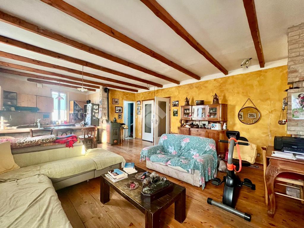 - Piano primo con ampio soggiorno caratterizzato da travi a vista e camino, cucina a vista, zona notte con due camere da letto, bagno e un ulteriore locale utilizzabile come studio o terza camera.